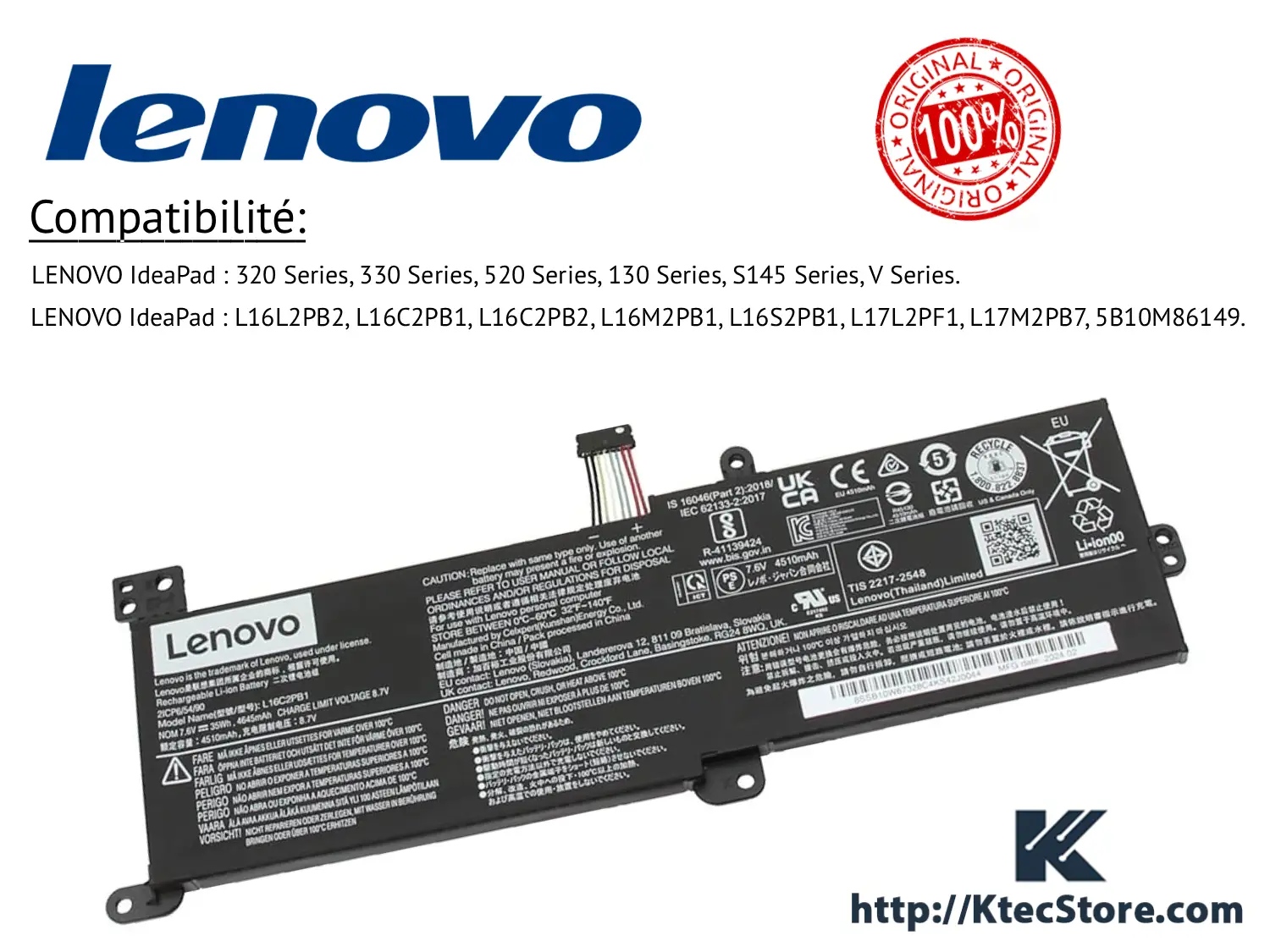 Grâce à sa conception conforme aux standards Lenovo, la batterie L16L2PB2 garantit une compatibilité parfaite, une sécurité optimale et une excellente longévité. Elle est largement utilisée sur les séries IdeaPad 320, 330, 520, 130, S145 ainsi que plusieurs modèles professionnels Lenovo V Series, ce qui en fait l’une des batteries les plus répandues sur le marché Lenovo.