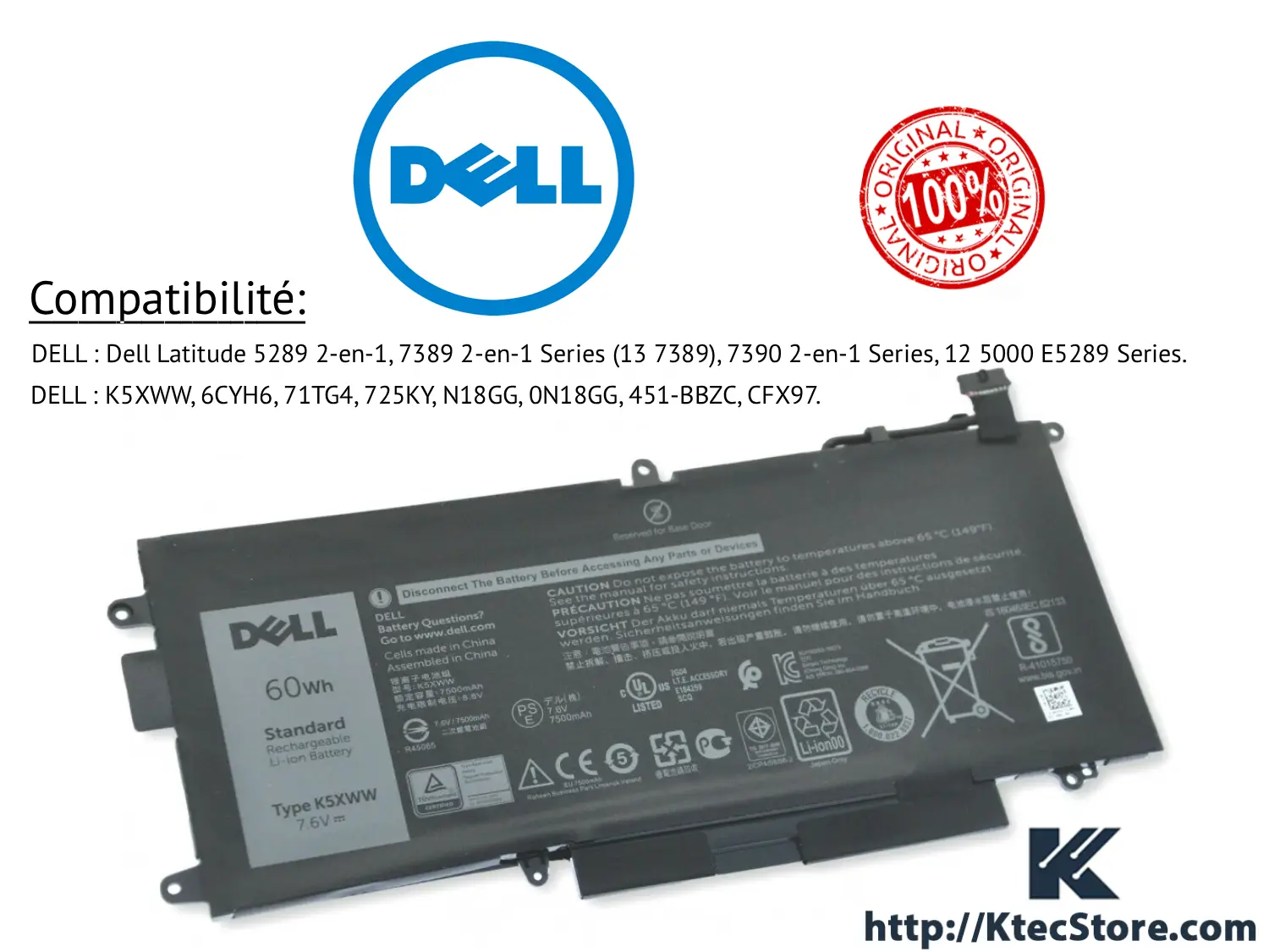 La batterie Dell K5XWW originale est une batterie interne haute performance conçue pour les appareils 2-en-1 de Dell. Avec une capacité généreuse de 60Wh et une tension de 7,6V, elle offre une autonomie prolongée et une stabilité énergétique idéale pour les usages professionnels, éducatifs et mobiles intensifs (visioconférence, bureautique, navigation, présentations).