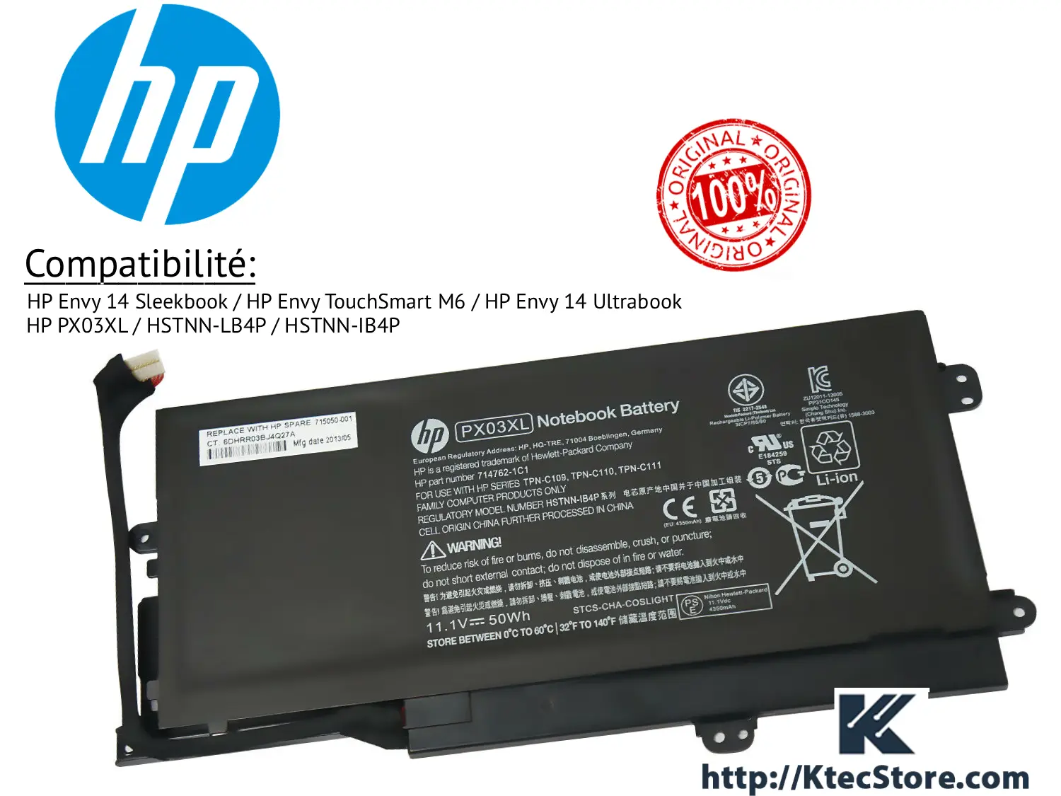La batterie HP PX03XL originale est conçue spécialement pour offrir une autonomie durable, une stabilité énergétique optimale et une compatibilité parfaite avec les ordinateurs portables HP Envy Sleekbook, HP Envy TouchSmart et certaines séries HP Ultrabook. Si votre laptop perd rapidement son autonomie, chauffe ou s’éteint soudainement, le remplacement par une batterie certifiée et sécurisée comme la PX03XL est la solution idéale pour retrouver les performances d’origine.