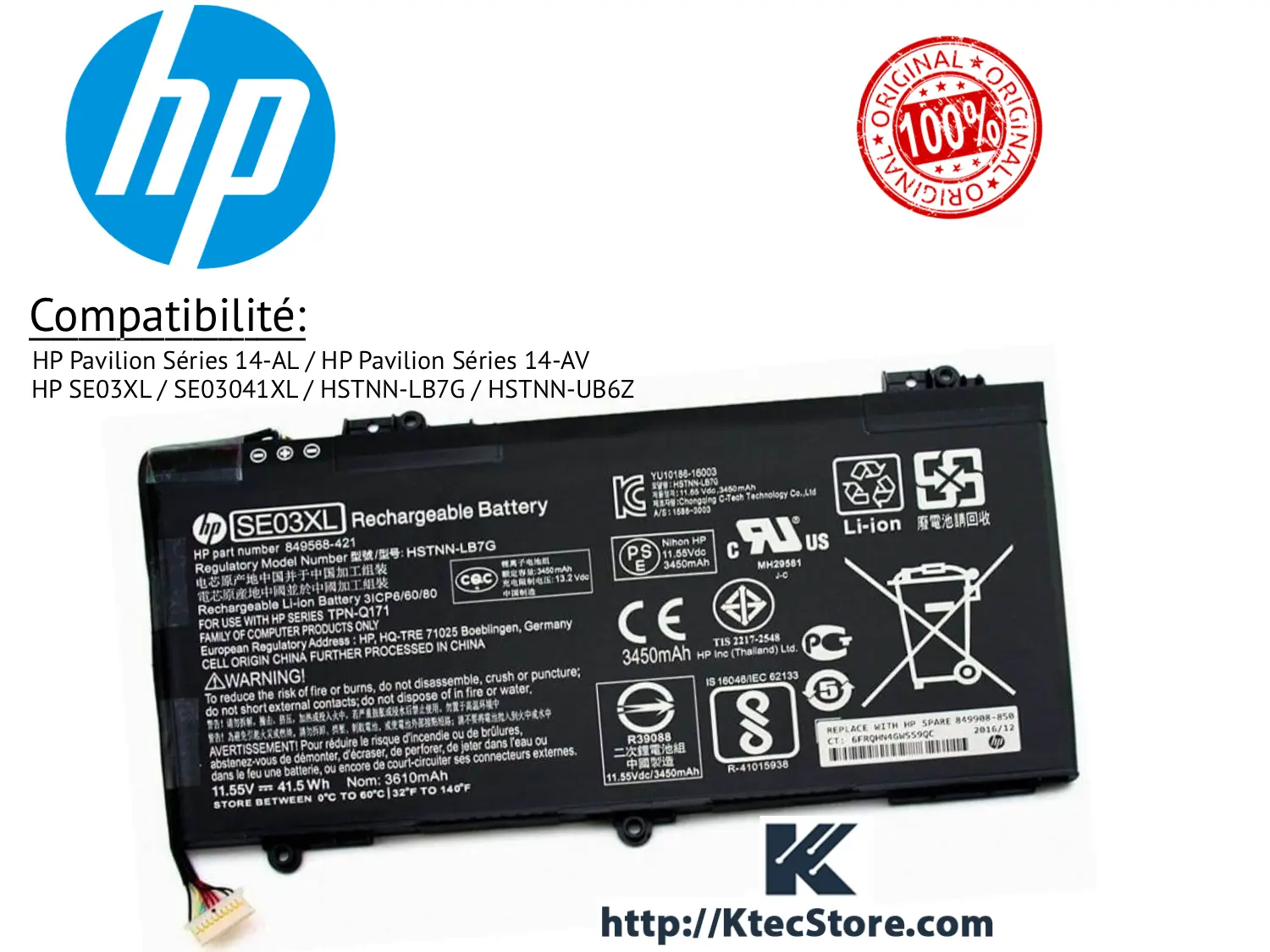 La batterie HP SE03XL est une batterie interne d’origine spécialement conçue pour les ordinateurs portables HP Pavilion 14-AL, 14-AV et quelques séries HP Envy 15-AS. Grâce à sa qualité OEM, elle garantit une autonomie stable, une compatibilité parfaite et une sécurité maximale pour votre PC portable HP.