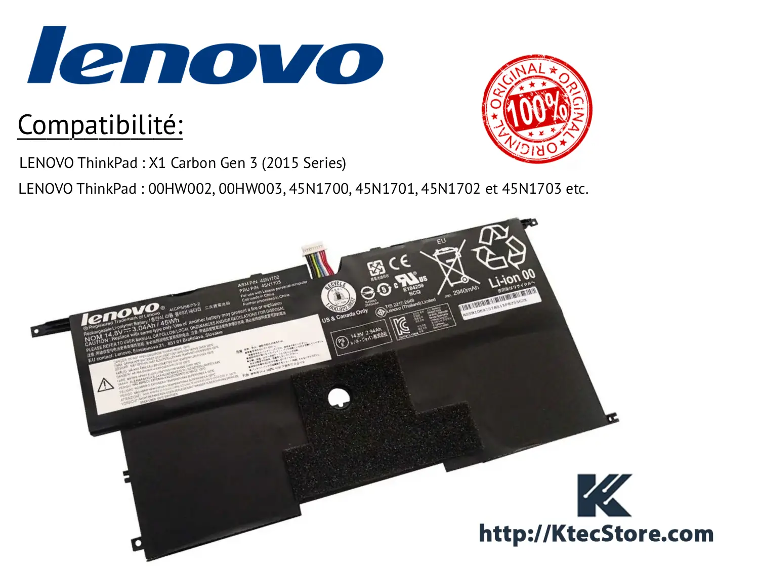 La batterie Lenovo 00HW002 originale est une batterie interne haute performance conçue spécifiquement pour le Lenovo ThinkPad X1 Carbon 3ᵉ génération (2015 Series). Destinée aux utilisateurs professionnels recherchant fiabilité, autonomie et sécurité, cette batterie garantit une compatibilité parfaite avec l’architecture fine et légère du X1 Carbon.