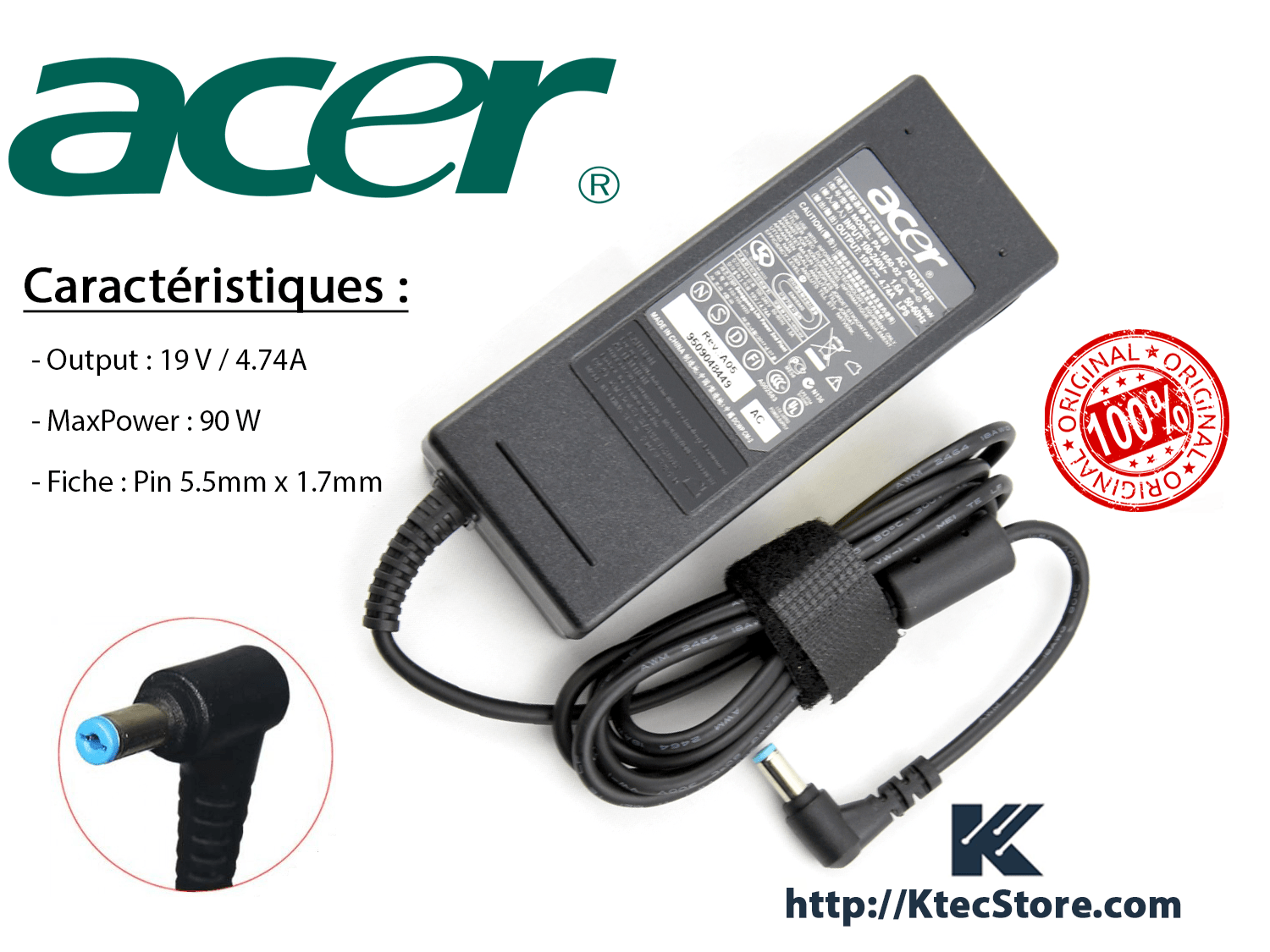 Modèles Compatible Chargeur ACER 90W ORIGINAL 19V 4.74A Fiche Pin 5.5mm x 1.7mm: